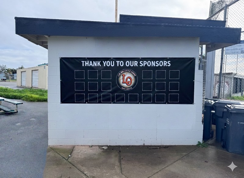 A 5x3' banner with your business name displayed at a Live Oak Little League field during the season.